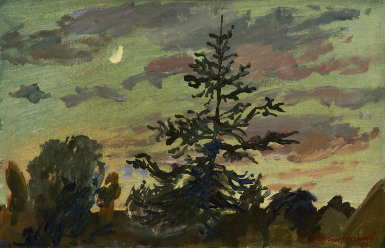 Kurpershoek, Theo1e kwartier; maannachtschilderslinnen op board, 18 x 24cm r.o. gesign. en gedat. 1982 ‘.__(‘Categorie’,’paolco-gallery-menu’).’: Klassiek modern