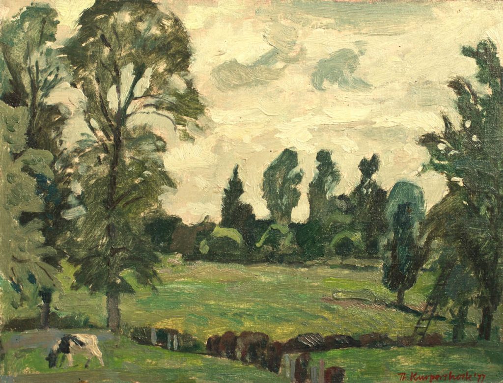 Kurpershoek, TheoHolle wegolieverf op doek, marouflĂ©, 28 x 36cm gesign. l.o. en gedat. 1969 ‘.__(‘Categorie’,’paolco-gallery-menu’).’: Klassiek modern