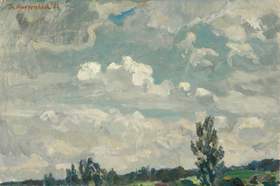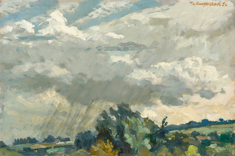 Kurpershoek, TheoWolkenlucht met regenbuiolie op doek, marouflé, 25 x 37cm gesign. r.b. en gedat. 1982 ‘.__(‘Categorie’,’paolco-gallery-menu’).’: Klassiek modern
